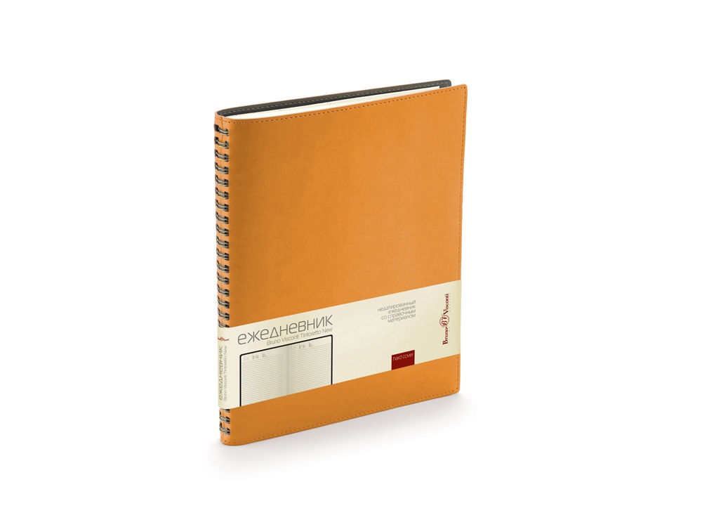 Недатированные деловой ежедневник «Tintoretto». Реальный шов по периметру в цвет материала Гибкий мягкий материал обложки прекрасно подходит для нанесения тиснения. Ежедневники выпускаются в формате В5, его размеры составляют 185 х 230 мм. Блок — 136 листов соединен полускрытым металлическим гребнем. Для блока используется высококачественная бежевая бумага, обладающая плотностью 70 грамм. В начале ежедневника расположены страницы со справочным материалом.