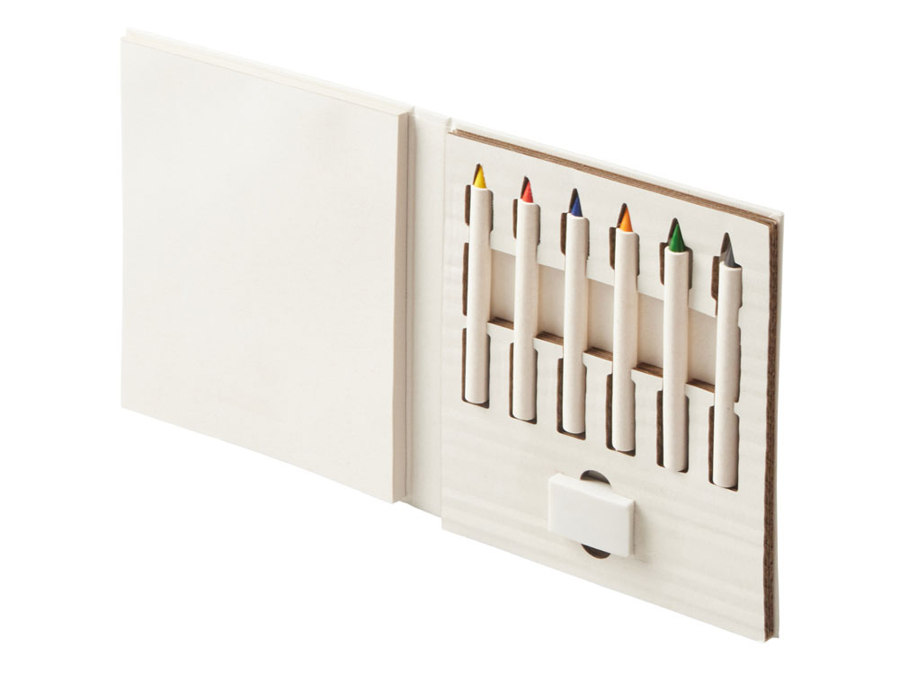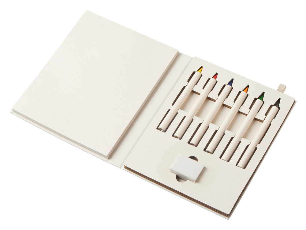 Набор для рисования из переработанных тетра-паков. Внутри 6 цветных карандашей, ластик и пустые листы для рисования.