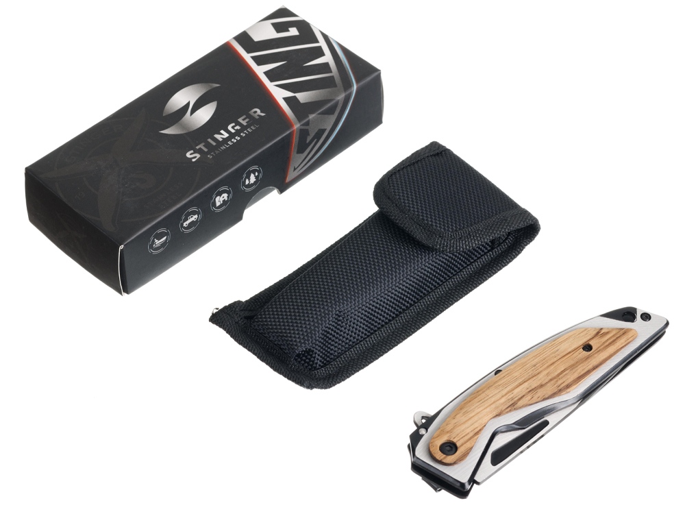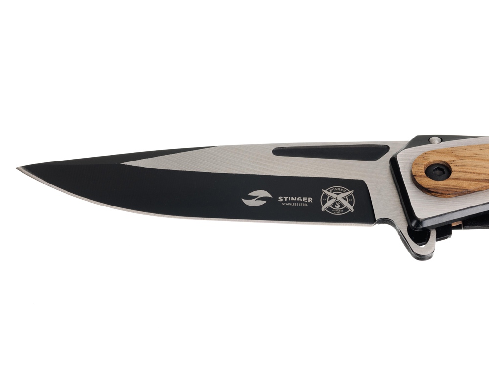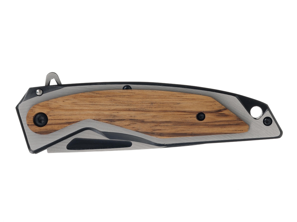 Рукоять ножа произведена из нержавеющей стали с накладками из древесины, собрана на втулках — “бонках”, поэтому при необходимости нож можно легко промыть. Нож быстро открывается при помощи флиппера с ассистом (механизм ускоренного открывания). На рукояти расположено отверстие для темляка и клипса для удобного размещения ножа в кармане.