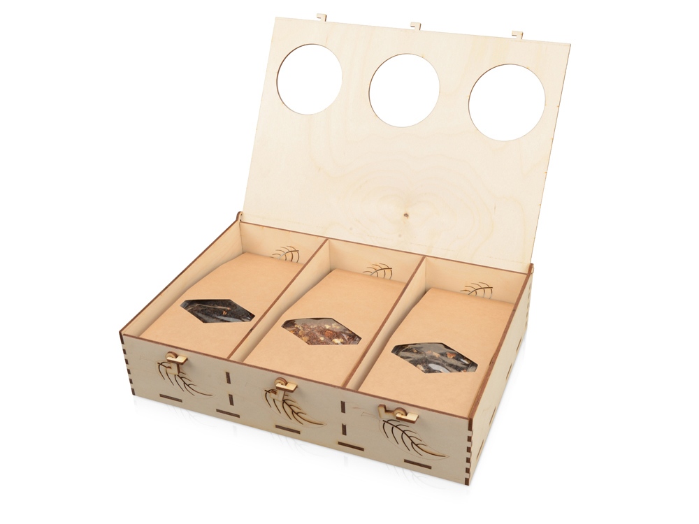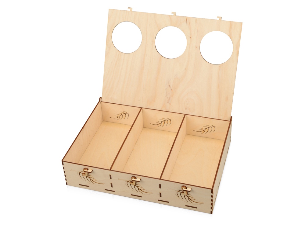 Подарочная коробка из трех секций, украшенная экопринтом в виде листа растения. В крышке над каждой из секций есть отверстие, чтобы можно было рассмотреть содержимое. Коробка выполнена из березовой фанеры и отлично гармонирует с наполнителем из крафтовой бумаги. Хотите нестандартно украсить подарок? Упакуйте его в подарочную коробку «Лист», она сохранит его содержимое в целости и сохранности.