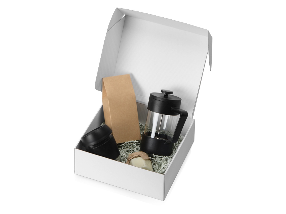 Набор «Бодрое утро» содержит все необходимое для действительно приятного пробуждения. В нем вы найдете все, что нужно для приготовления вашей первой чашечки кофе с утра: френч-пресс, упаковку робусты темной обжарки, стакан с силиконовыми деталями и баночку крем-меда, который составит прекрасную пару крепкому напитку. Набор упакован в белую картонную коробку и переложен бумажным наполнителем.