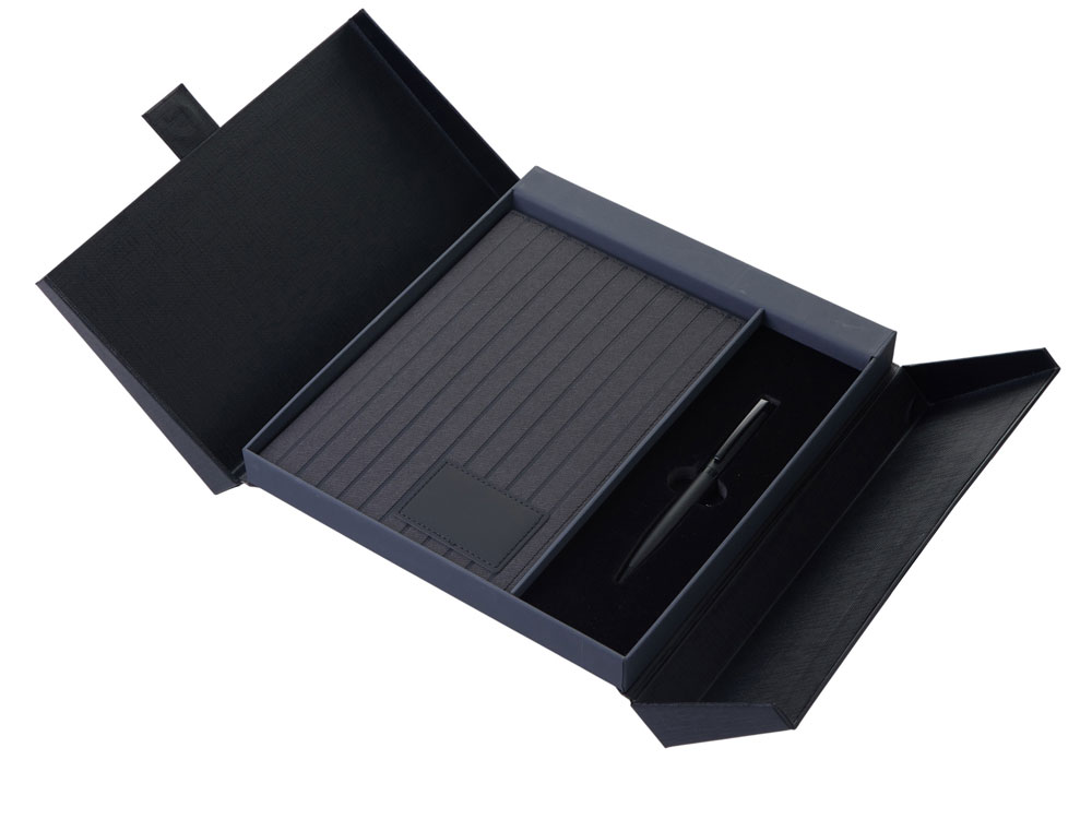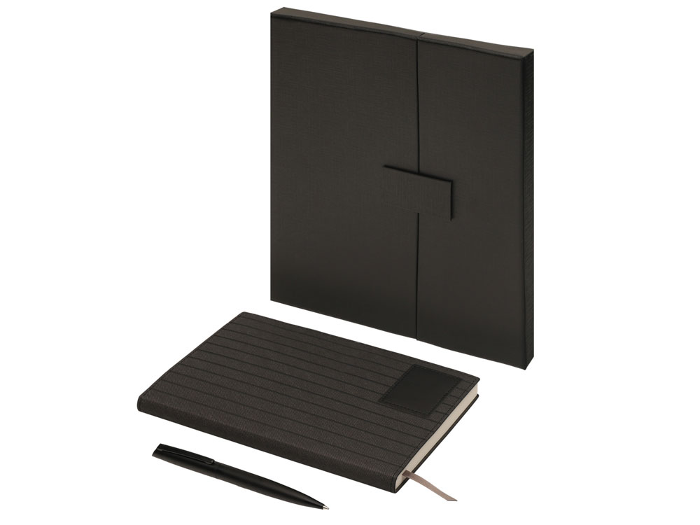 «Bradbury & Co» — это элегантный подарочный набор, упакованный в красивую коробку на магните. Внутри — блокнот в обложке из рифленой экокожи и металлическая шариковая ручка. Ручка гармонирует с блокнотом за счет рифленой нижней части, а блокнот имеет специальный патч для нанесения логотипа (который можно также нанести на более ровную поверхность на обороте блокнота) и ляссе-закладку для удобства. При гравировке на ручке вскрывается эффектный серебристый цвет.