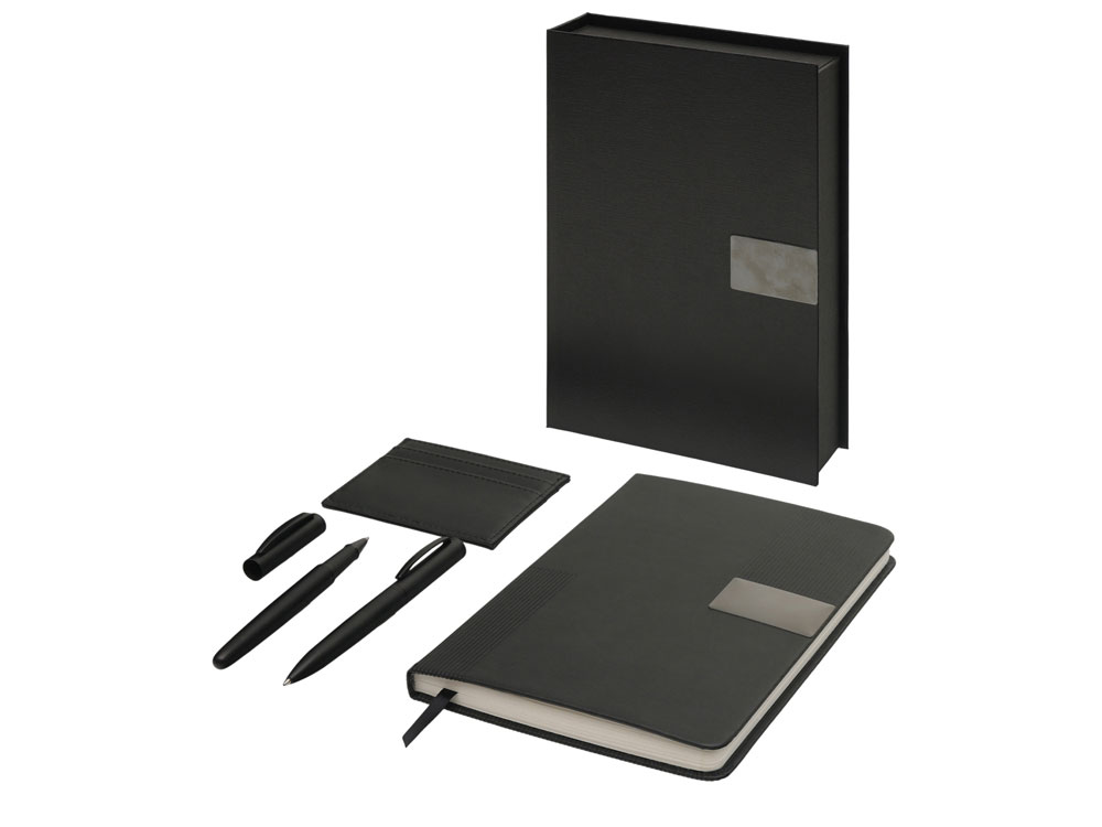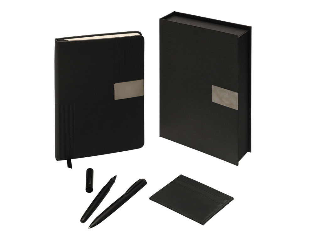 «Goethe» — это премиальный подарочный набор в коробке, закрывающейся на магнит. Комплект включает две ручки — шариковую и роллер — с высококачественными синими немецкими чернилами Dokumental и пишущими узлами Premec (в шариковой). Их дополняет картхолдер из экокожи на 4 карты с отделением для наличности. Завершает этот комплект блокнот в твердой обложке из искусственной кожи. Внутри него 96 листов кремовой бумаги с FSC-сертификатом плотностью 80 г/м2.