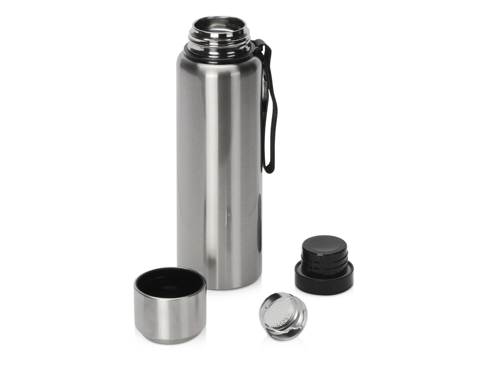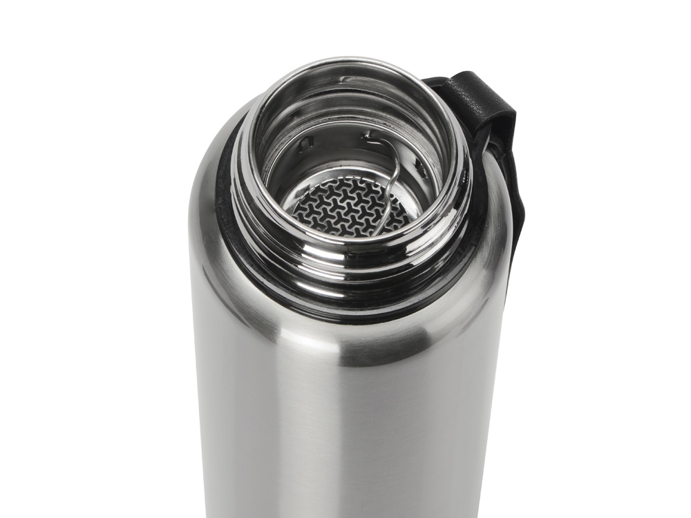 Вакуумный термос c двойными стенками из «пищевой» нержавеющей стали 304 марки для небольших путешествий и отдыха на природе. Надежно удерживает тепло и холод в течение 24 часов. Крышку можно использовать в качестве чашки. В комплекте имеется съемное ситечко из нержавеющей стали. Имеется прочный и удобный ремешок для переноски. Объем 800 мл.